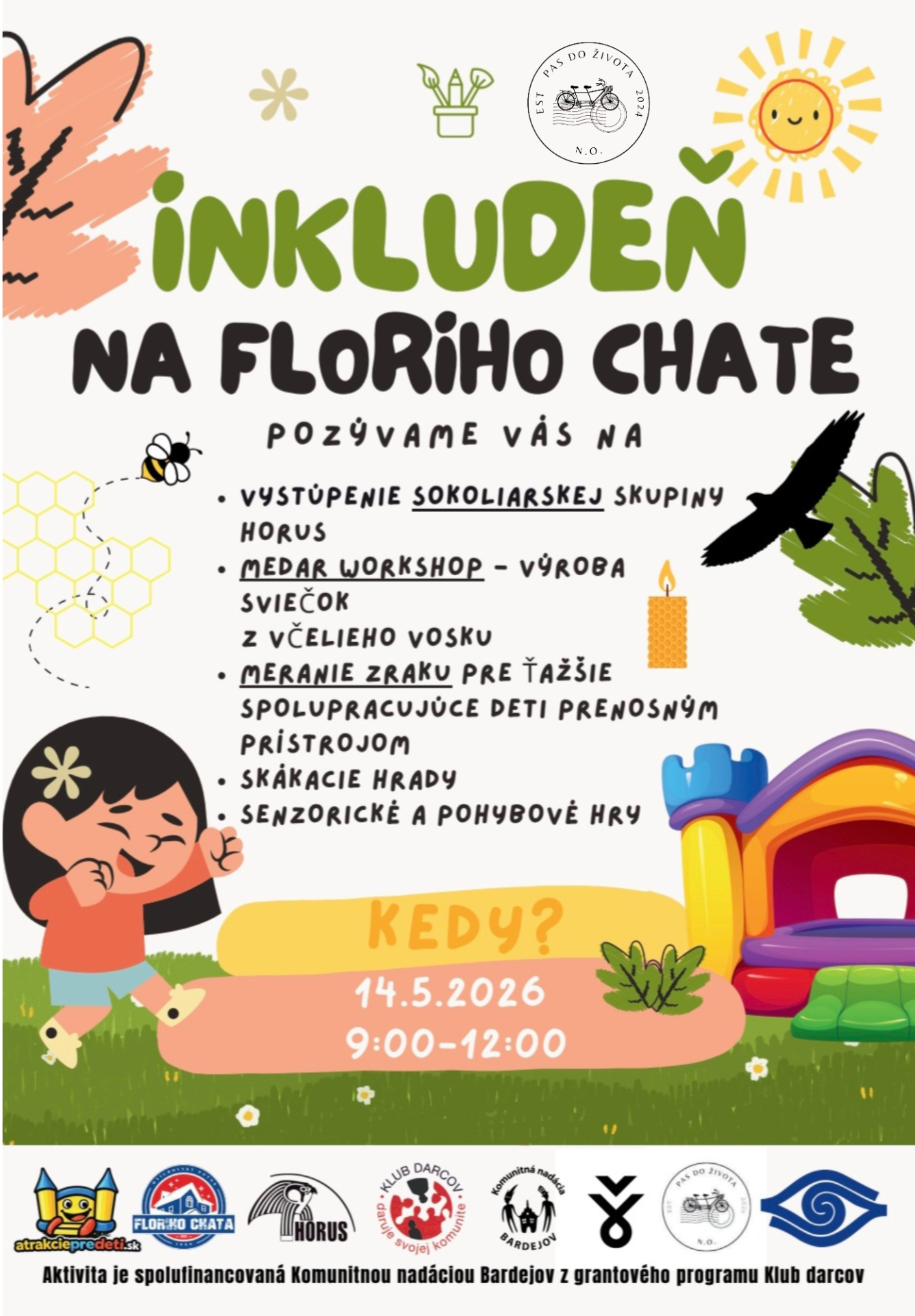 V máji chystáme dopoludnie plné hier a zábavy pre špeciálne triedy na základných a špeciálnych školách. Na programe sú rôzne senzorické a pohybové hry, skákací hrad, kvízy, meranie zraku, workshop zameraný na výrobu produktov zo včelieho vosku s pani Voľanskou z Medaru a tiež sokoliari zo skupiny Horus. Vidíme sa 14.5.2026 na Floriho chate v krásnom prostredí Mníchovského potoka v Bardejove.